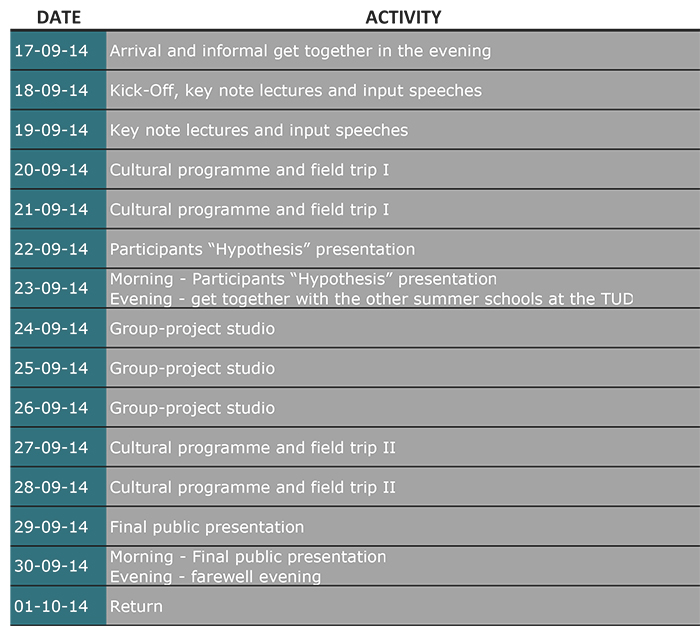 The summer school programme focuses on cross-disciplinary project work and interactive workshops. Theoretical input will be delivered in keynote speeches from renowned international scholars and practitioners (tbd). Additional impulse lectures will be given by TU Dresden faculty members of the departments