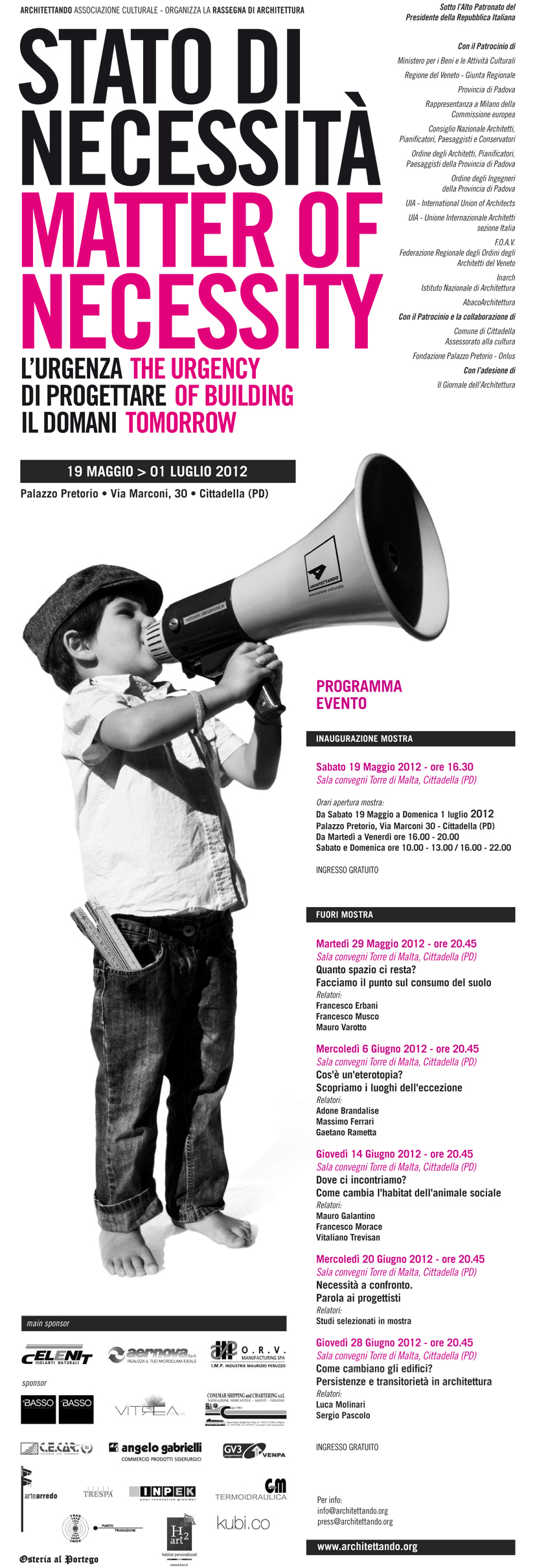 Stato di necessità presenta gli esiti di una selezione nazionale che raccoglie alcuni interessanti progetti realizzati in Italia, ai quali si aggiunge una sezione di opere di prestigiosi studi internazionali, che contribuisce ad ampliare lo sguardo sul tema e sulle sue molteplici implicazioni. L’argomento verrà dibattuto in un ciclo di conferenze che coinvolgeranno esperti italiani in diversi ambiti, portando un contributo ed un confronto multidisciplinare per l’approfondimento del tema. Le conferenze si terranno presso la Sala convegni Torre di Malta, Cittadella (PD).