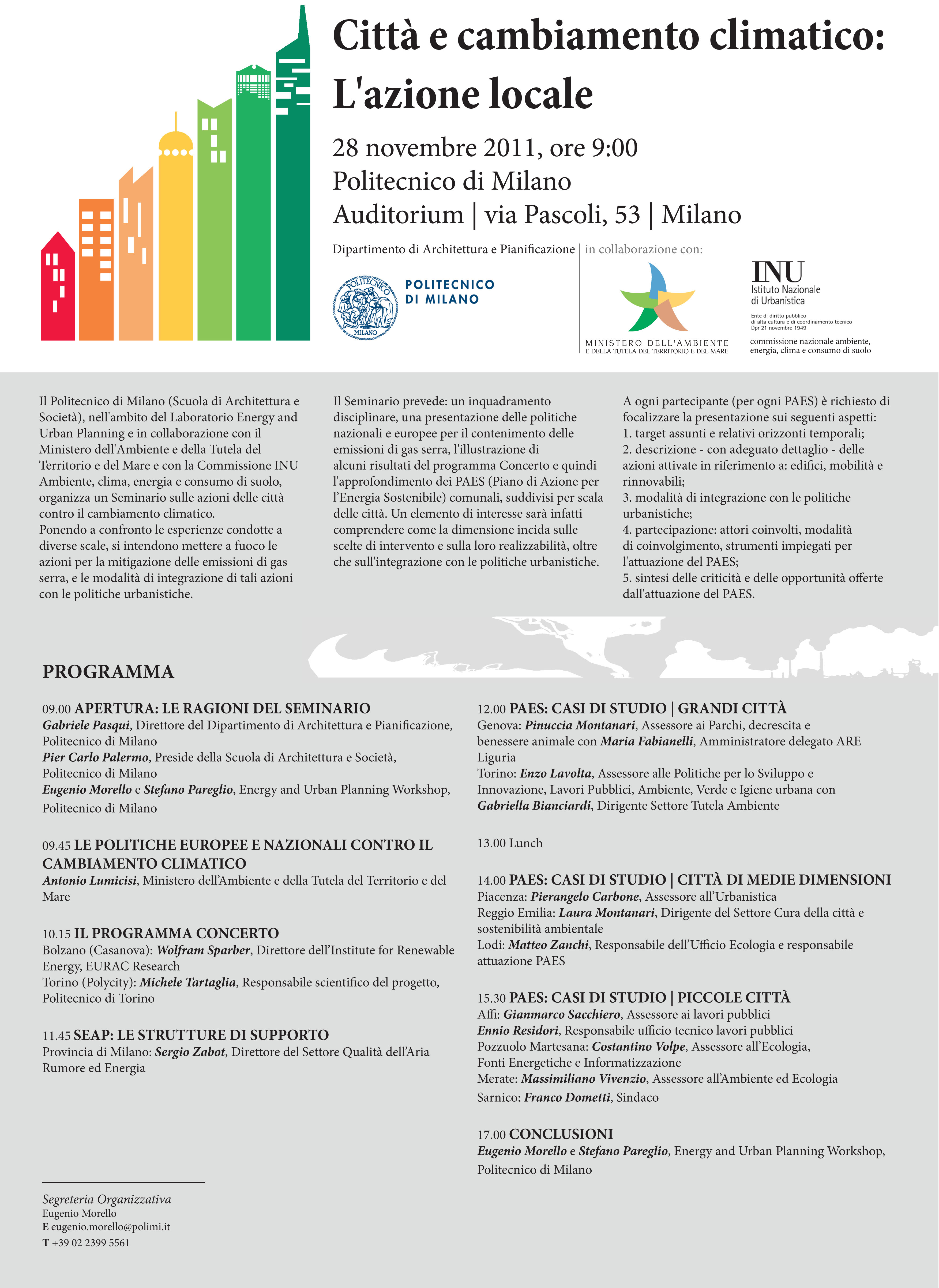 Il Politecnico di Milano, Scuola di Architettura e Società, nell'ambito del Laboratorio Energy and Urban Planning, in collaborazione con il Ministero dell'Ambiente e della Tutela del Territorio e del Mare, e con la Commissione INU Ambiente, Clima, Energia e Consumo di suolo, organizza un Seminario sulle azioni delle città contro il cambiamento climatico.