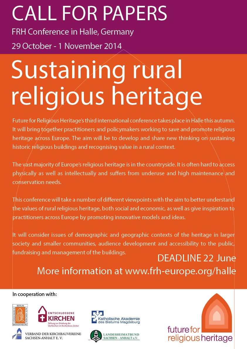 FRH is the only European network of charities, governmental, religious and university departments, which work to protect religious heritage buildings and interiors across Europe. It is a not for profit, non-religious organization open to all peoples. Future for Religious Heritage’s third international conference takes place in Halle this autumn. It will bring together practitioners and policymakers working to save and promote religious heritage across Europe. The aim will be to develop and share new thinking on sustaining historic religious buildings and recognising value in a rural context.