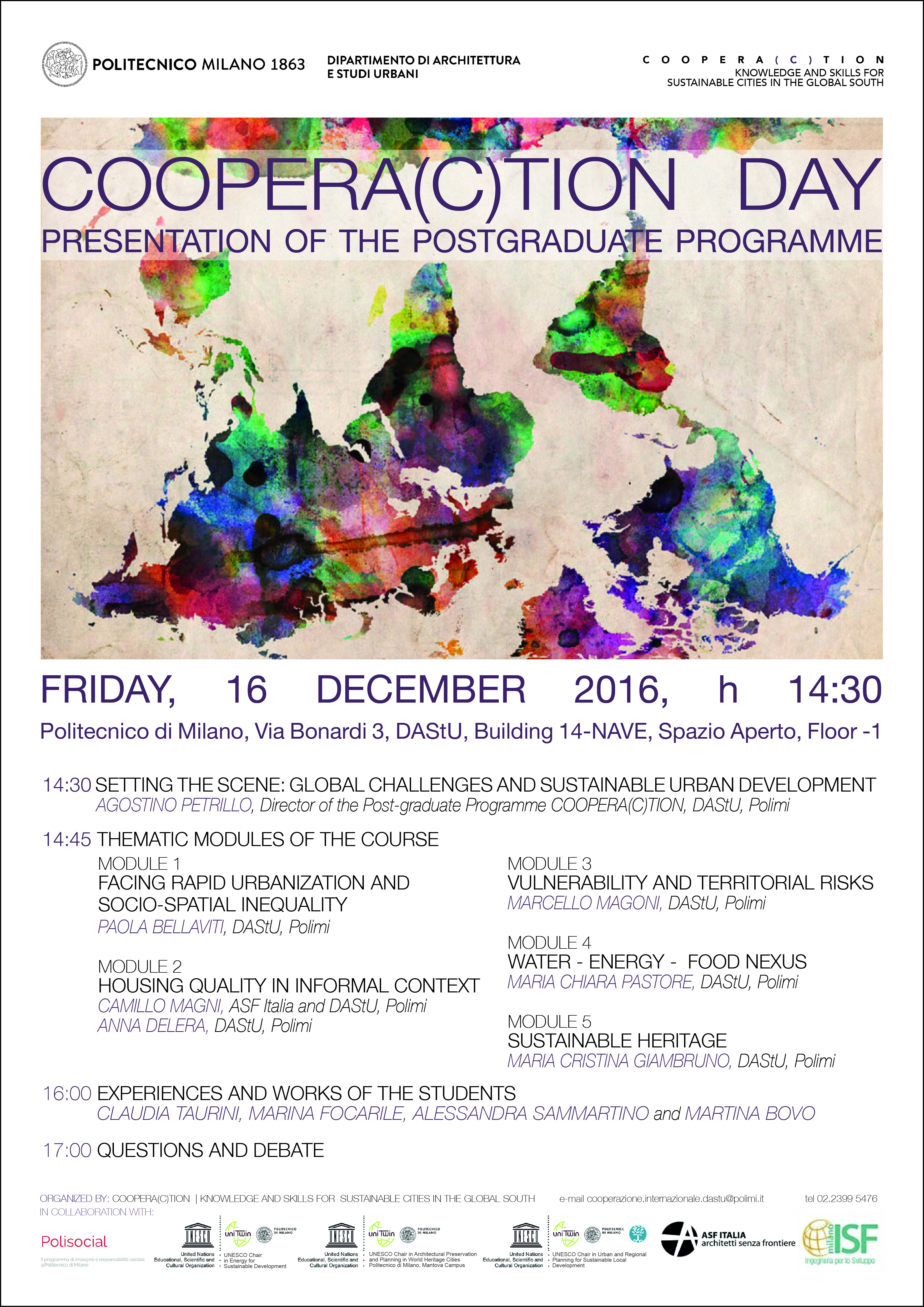 The fourth edition of the Post Graduate Programme COOPERA(C)TION, starting in March 2017, offers to new generation of experts the chance to acquire skills and knowledge that will help them to develop an integrated and multidisciplinary approach to planning, design and management of urban settlements and territories in contexts with a high level of social, economic, territorial, and landscape vulnerability.